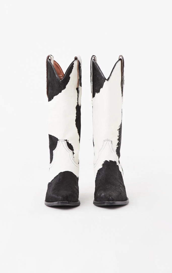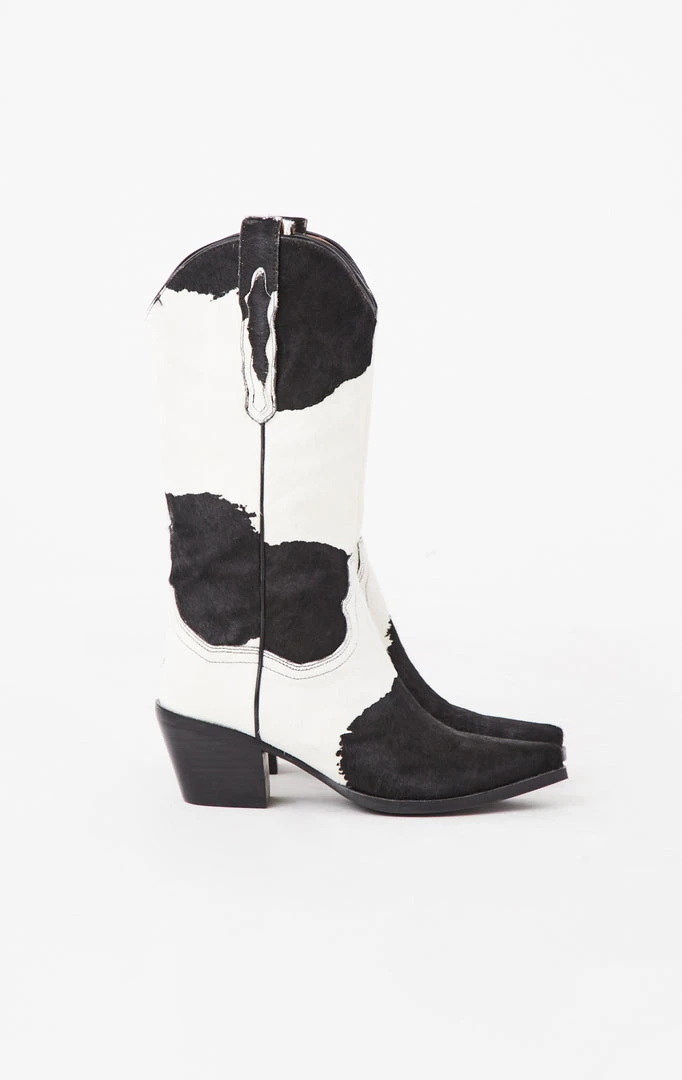 The Dagget Western Mid Calf Cowboy Boot in brown white cow by Jeffrey Campbell. The perfect genuine calf hair cowboy boot with classic western detailing, pointed toe and a block heel.Â