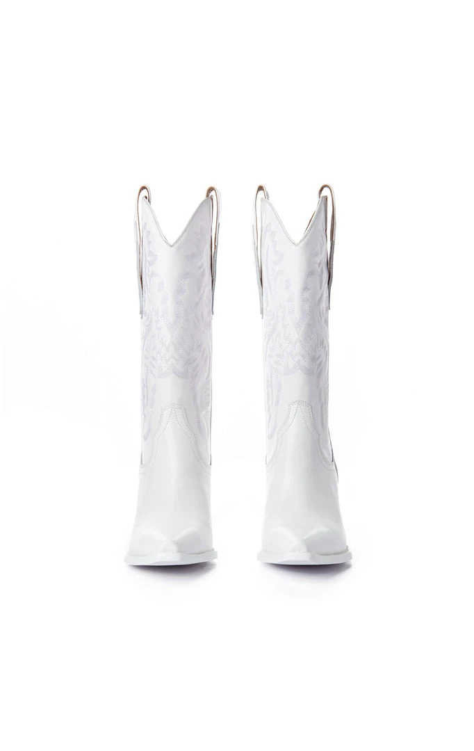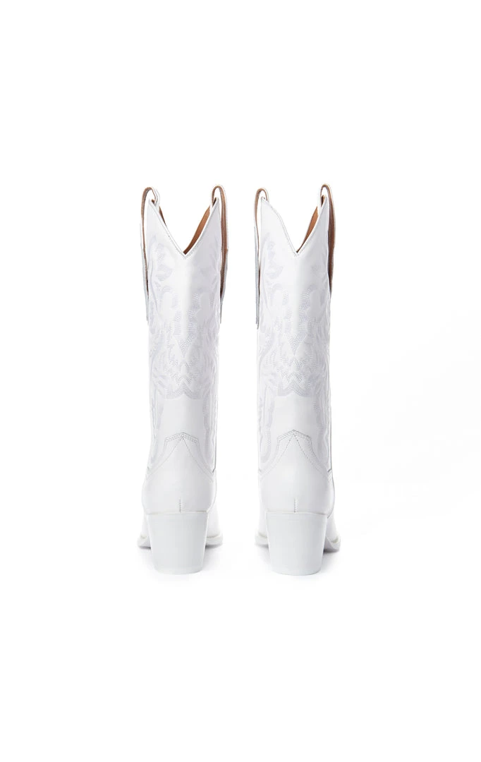 Bring power to your steps with the Dagget Western Mid Calf Cowboy Boot in white by Jeffrey Campbell. The perfect leather boot with classic western detailing, pointed toe and a block heel. These boots are a styling dream, you’ll want both colors.Â