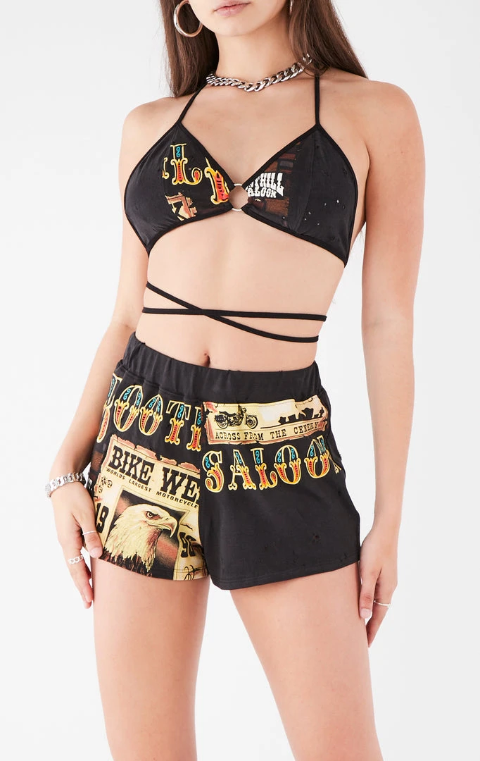 Furst of a Kind took a vintage Bike Week tee and reworked it into a two-piece set. This set is complete with a bra wrap top and shorts.