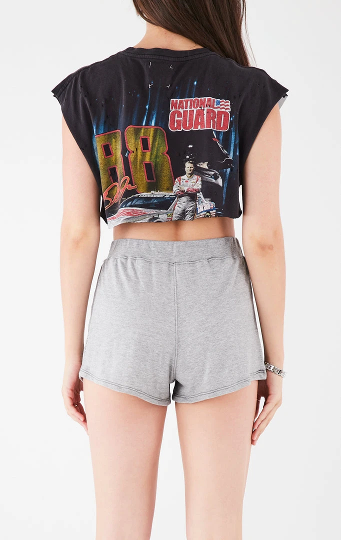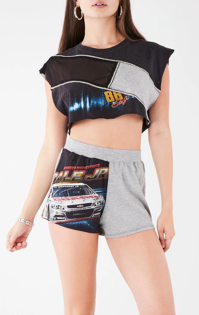 This one-of-a-kind mixed media sleeveless top and short set was crafted by Furst of a Kind from a vintage Nascar tee. Spliced together with another vintage t-shirt, sheer black mesh panels and finished with rhinestone trim.