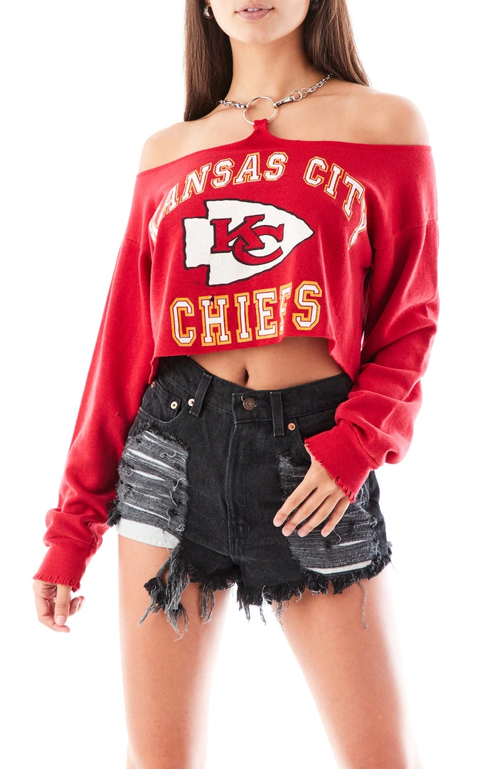 Embrace your inner baddie in this vintage Kansas City Chiefs sweatshirt. Furst of a Kind created a whole new attitude with this reworked style. Featuring shoulder cut outs, cropped length and an insane silver chain detail at the neck. We love vintage NFL sweatshirts no matter what, but this piece will make all your other vintage jealous.
