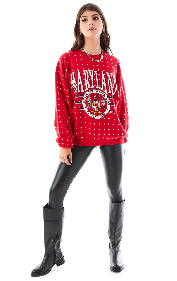 It’s all about the bling, baby. This one of a kind vintage University of Maryland sweatshirt boasts some serious sparkle. The Furst of a Kind team embellished this piece by hand, featuring Allover Rhinestone embellishment scattered across the bodice and sleeves. Dress it up or dress it down, but this beauty is meant to shine.