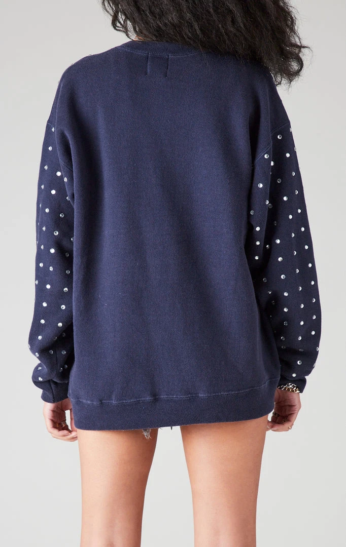 This one of a kind vintage University of Notre Dame sweatshirt boasts some serious sparkle. The Furst of a Kind team embellished this piece by hand, featuring Allover Rhinestone embellishment scattered across the bodice and sleeves.