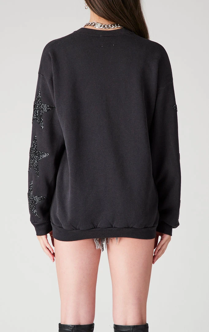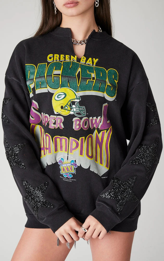 The Furst of a Kind all star. This vintage one of a kind Green Bay Packers sweatshirt was handpicked by Furst of a Kind as the perfect foundation to totally rework and bling out with black star patches on the sleeves. How could you not be starstruck? You know you want it.