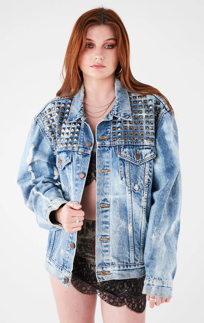 One-of-a-kind vintage Levi’s denim jacket.Ā This Levi’s vintage denim jacketĀ was reworked by hand in Los Angeles by Furst of a Kind with a bleach treatment and studding.