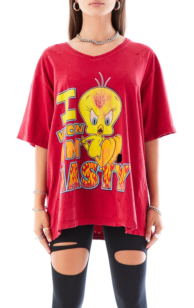 Seriously, what’s better than cartoons & vintage? Furst of a Kind hand sourced this vintage Tweety Bird tee and turned your nostalgic childhood memories into a vintage top you can wear every day. Want some added luxury? This piece has been stonewashed to ensure a natural distressing and vintage fabric feel. We love this for you- time to start collecting.Â