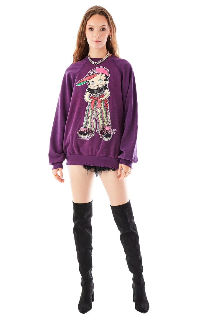 What time is it? Toon time. Furst of a Kind hand sourced this perfect vintage Betty Boop cartoon sweatshirt to satisfy all of your Saturday morning nostalgia. This one was found in Los Angeles by the Furst of a Kind team & reworked just a touch to maintain its original integrity. It features stone washing for an ultra worn-in, effortless look. You know what to do.Â