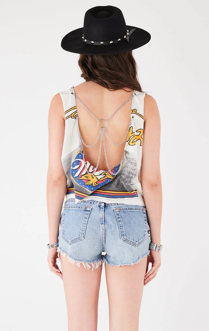 This vintageĀ NascarĀ tee was reworked by Furst of a Kind. Upcycled in Los Angeles with a stonewash technique, sleeveless cut, chain overlay and cutout back.