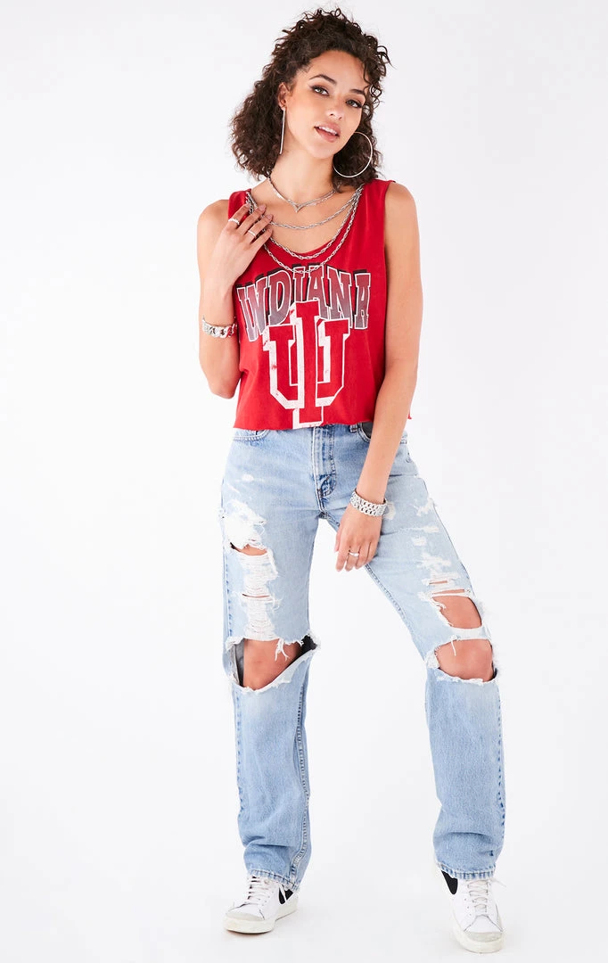 This vintage Indiana University tee was reworked by Furst of a Kind. Upcycled in Los Angeles with a stonewash technique, sleeveless cut, chain overlay and cutout back.