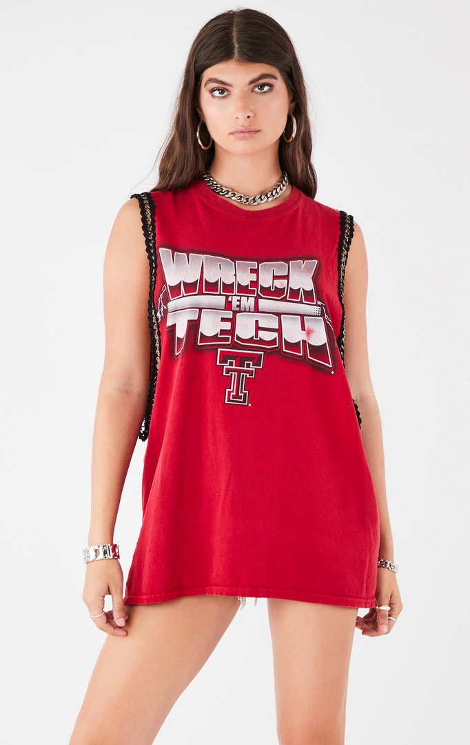 This vintageĀ Texas Tech University tee was sourced and reworked by Furst of a Kind in Los Angeles. FeaturesĀ a dramatic sleeveless cut linedĀ withĀ chain trim.Ā