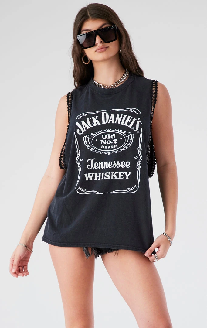 This vintage Jack Daniel’s tee was sourced and reworked by Furst of a Kind in Los Angeles with a dramatic sleeveless cut and lined with chain trim.Â