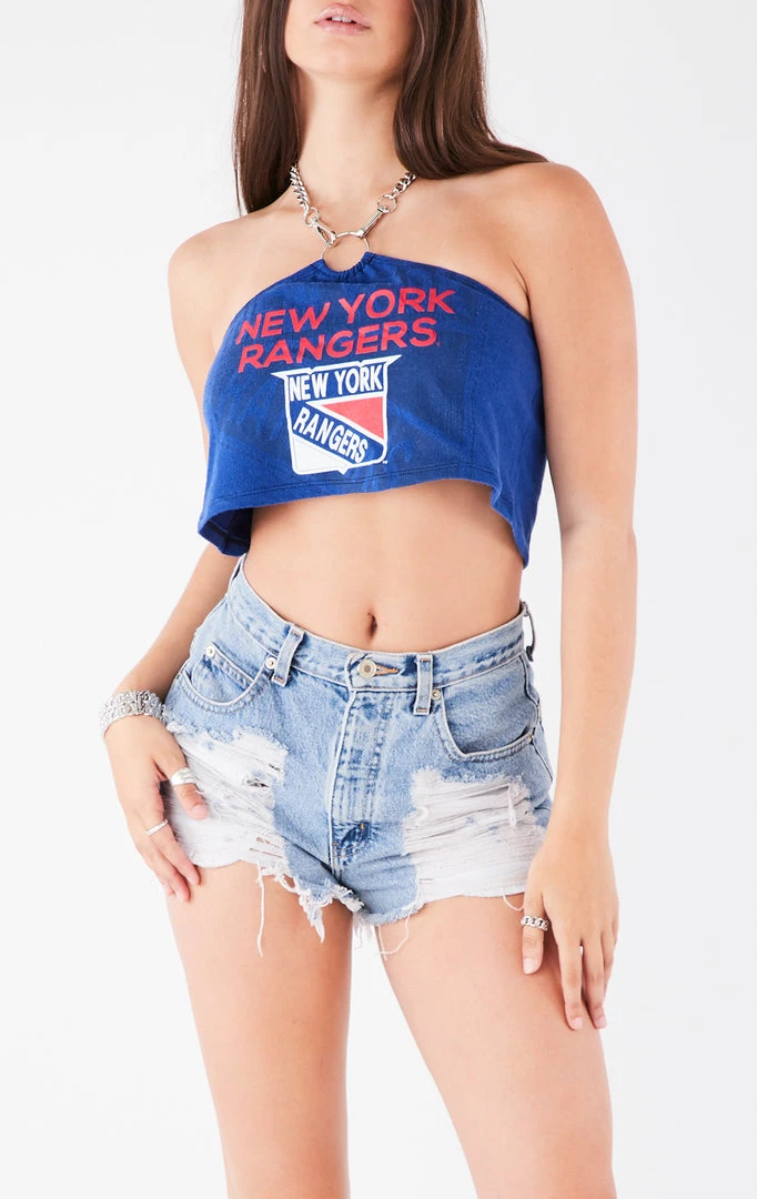 This one-of-a-kind vintage New York Rangers tee was reworked into a halter top by Furst of a Kind. Features a cropped halter cut & chunky silver chain detailing at the neckline.