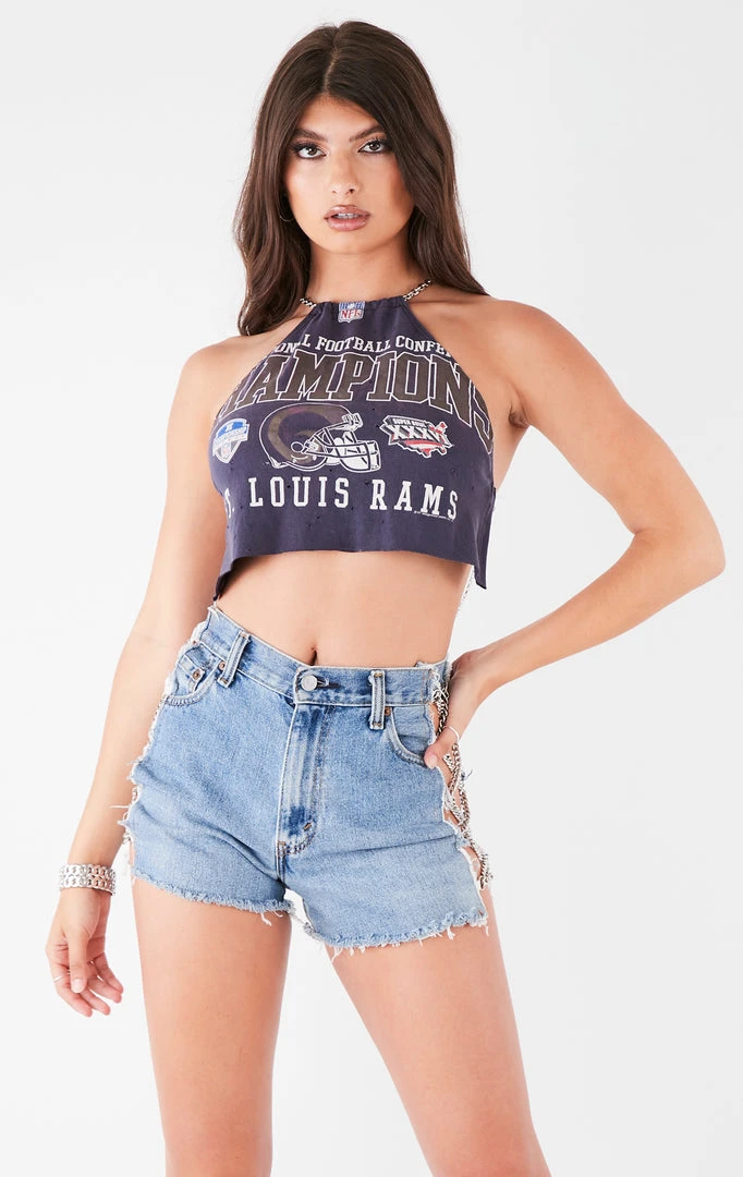 This vintage St. Louis Rams tee was upcycled by Furst of a Kind. Reworked in Los Angeles with halter neck, waterfall chain back detail and crop cut.