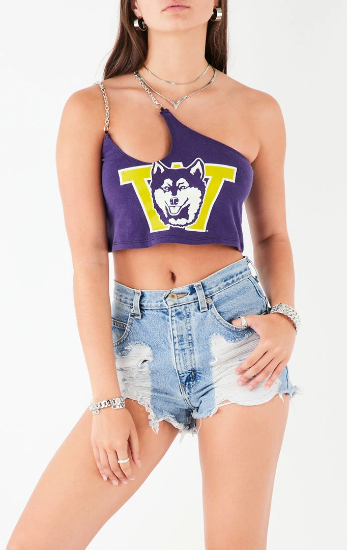 Furst of a Kind took this vintage University of Washington tee and reworked it into a one shoulder tank top. This tank is complete with a one-shoulder cut out, cropped hem and double chain straps.Â