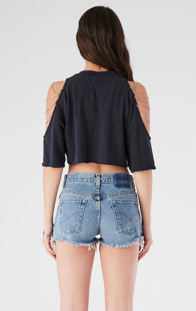 Furst of a Kind created a whole new attitude with this vintage Jack Daniel’s tee. Reworked with a stonewash technique, cropped length and cut out shoulder detailing that is draped in silver chains.