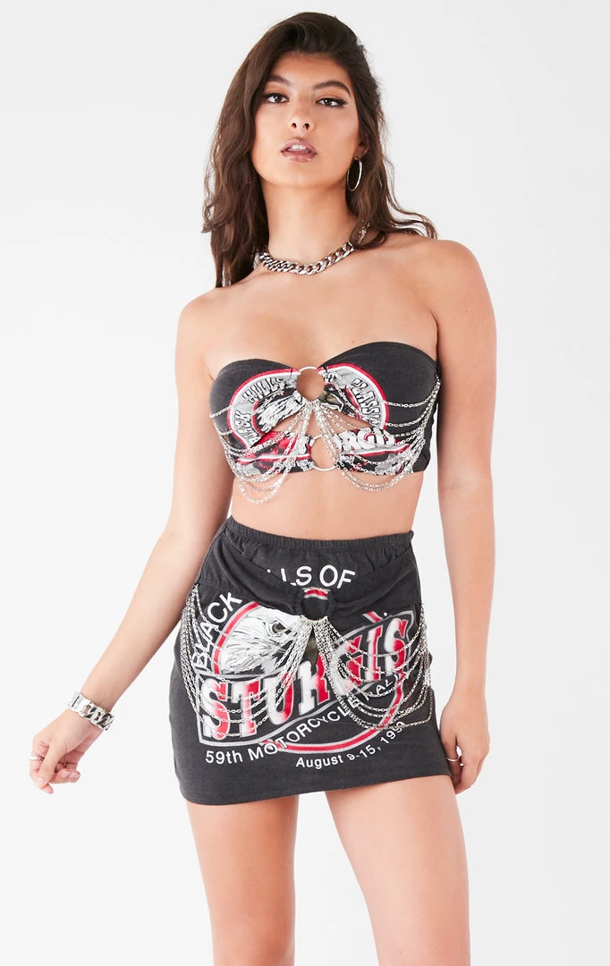 This vintageĀ Sturgis t-shirt was reworked by Furst of a Kind into a one-of-a-kind two piece set. This tube top and skirt set featuresĀ waterfall chain detailing.Ā