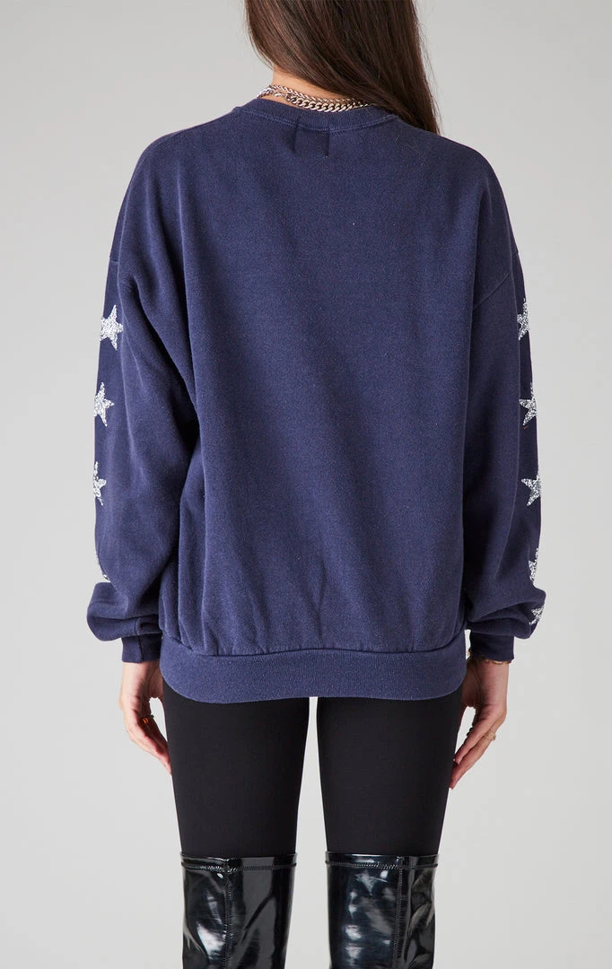 This vintage sweatshirt is taking star patches to the next level. Furst of a Kind reworked this vintage Penn State University sweatshirt with mini silver rhinestone star patch embellishment down the sleeves. It’s all in the details.
