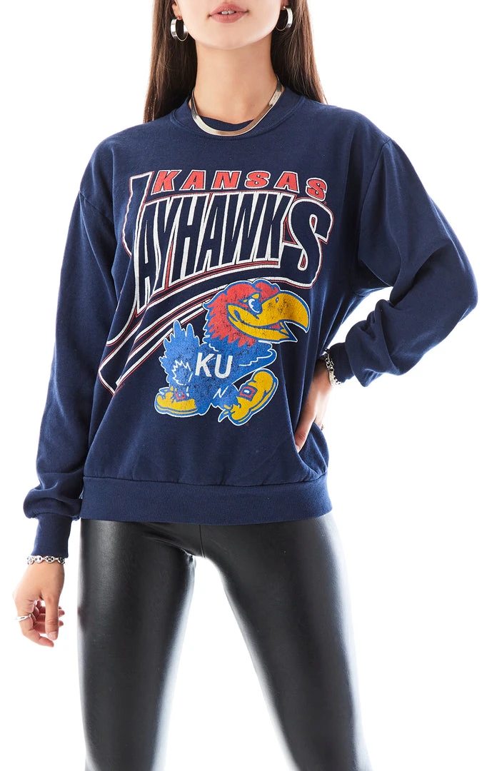 THE perfect vintage University of Kansas sweatshirt. Period. Let’s be honest, a classic college vintage sweatshirt never goes out of style. This one was sourced in Los Angeles by the Furst of a Kind team & reworked just a touch to maintain its original integrity. It features stone washing for an ultra worn-in, effortless look. You can really never have enough.