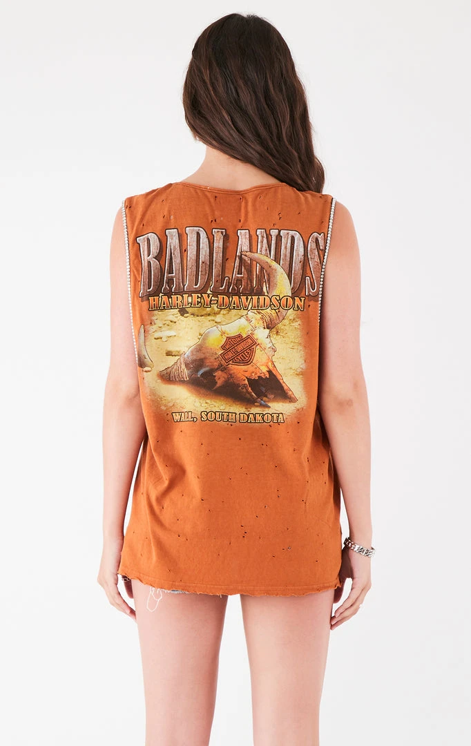 This vintage Harley Davidson tee was sourced and reworked in Los Angeles by Furst of a Kind. Features a dramatic sleeveless cut and deep v with criss cross rhinestone trim.