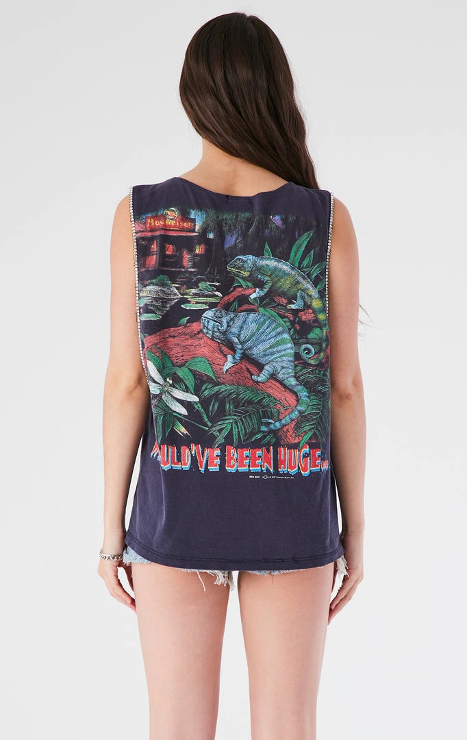 This vintage Budweiser tee was sourced and reworked in Los Angeles by Furst of a Kind. Features a dramatic sleeveless cut and deep v with criss cross rhinestone trim.