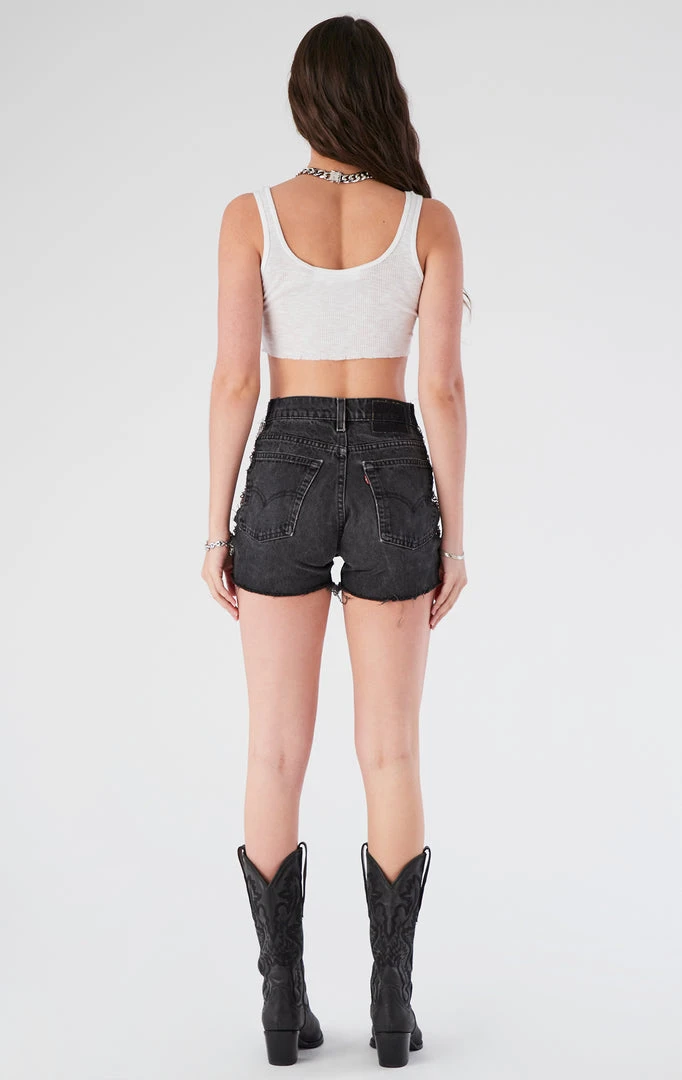 Fully transformed by Furst of a Kind, these vintage denim shorts were reworked in Los Angeles from vintage Levi’s denim. Features silver criss cross chain detailing on both sides and a raw hem.