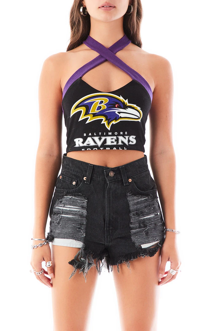 We love this for you. Furst of a Kind took a vintage Baltimore Ravens tee and reworked it into the sickest tailgate top ever, hands down. We love the contrast criss cross neckline that creates the perfect little peekaboo moment at the bust. It’s remade vintage like you’ve never seen before.