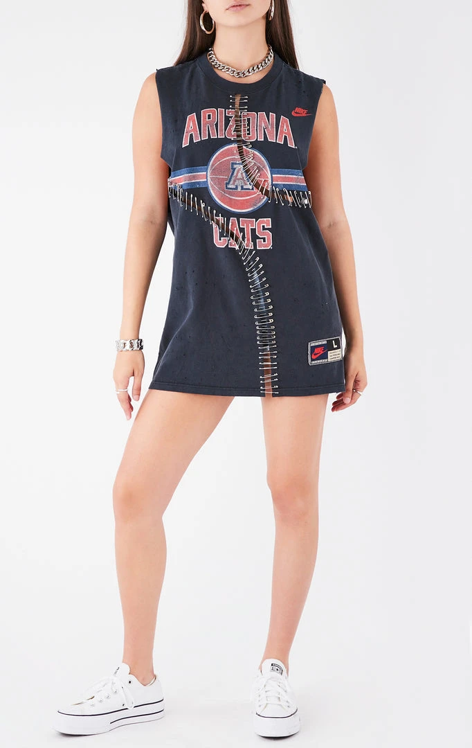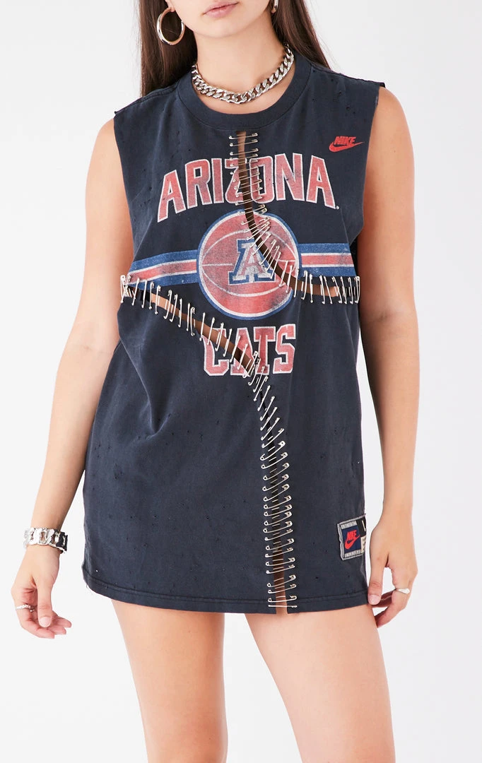 Furst of a Kind reworked this vintage University of Arizona tee. Features a dramatic sleeveless cut and curved ladder cutouts with safety pin detail.Â