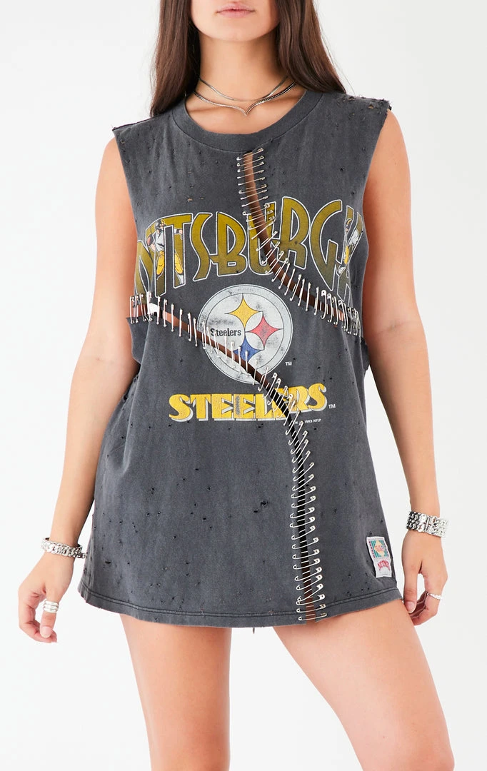 Furst of a Kind reworked this vintage Pittsburgh Steelers tee. Features a dramatic sleeveless cut and curved ladder cutouts with safety pin detail.Â