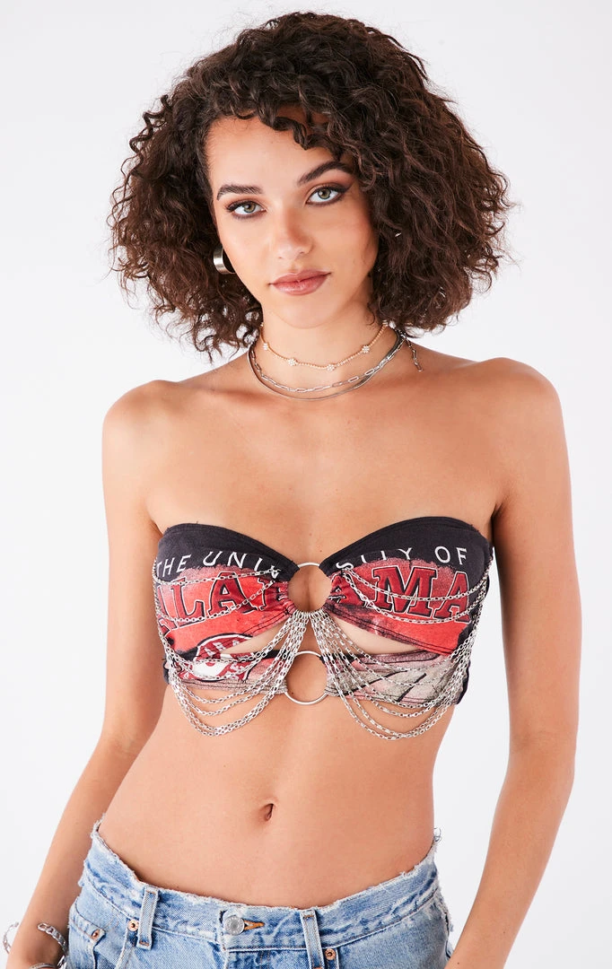 This vintage University of Alabama tee was reworked into a tube top. Features a flattering cut out, cropped length, double o-rings and finished off with waterfall chain detailing.Â
