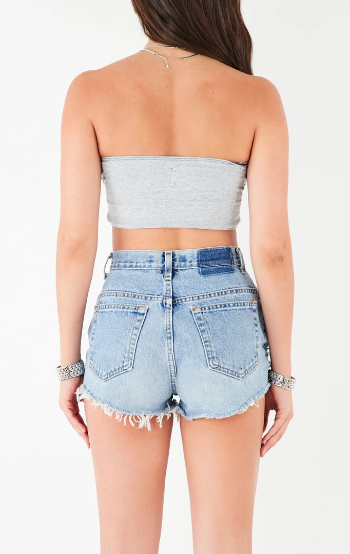 This vintage University of Michigan tee was reworked into a tube top. Features a flattering cut out, cropped length, double o-rings and finished off with waterfall chain detailing.Â