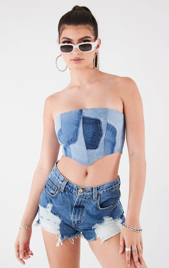 This vintage spliced denim corset tube top. Furst of a Kind reworked vintage denim, creating this one of a kind corset shape with lace up detailing closure at the back.