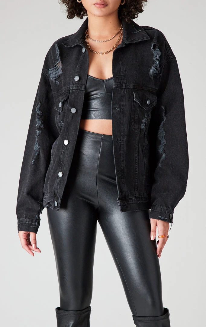 It’s all about the back detail on this one-of-a-kind repurposed black denim jacket. Furst of a Kind reworked this denim jacket with a vintageĀ University ofĀ Kentucky graphicĀ insert on the back.