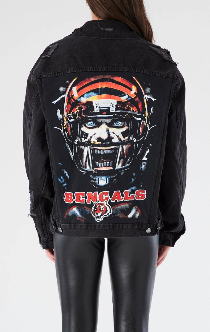 Hate to see you go, but love to watch you leave. It’s all about the back detail on this one of a kind repurposed black denim jacket. Furst of a Kind added a vintage Cincinnati Bengals graphic on the back and we are officially obsessed.Ā