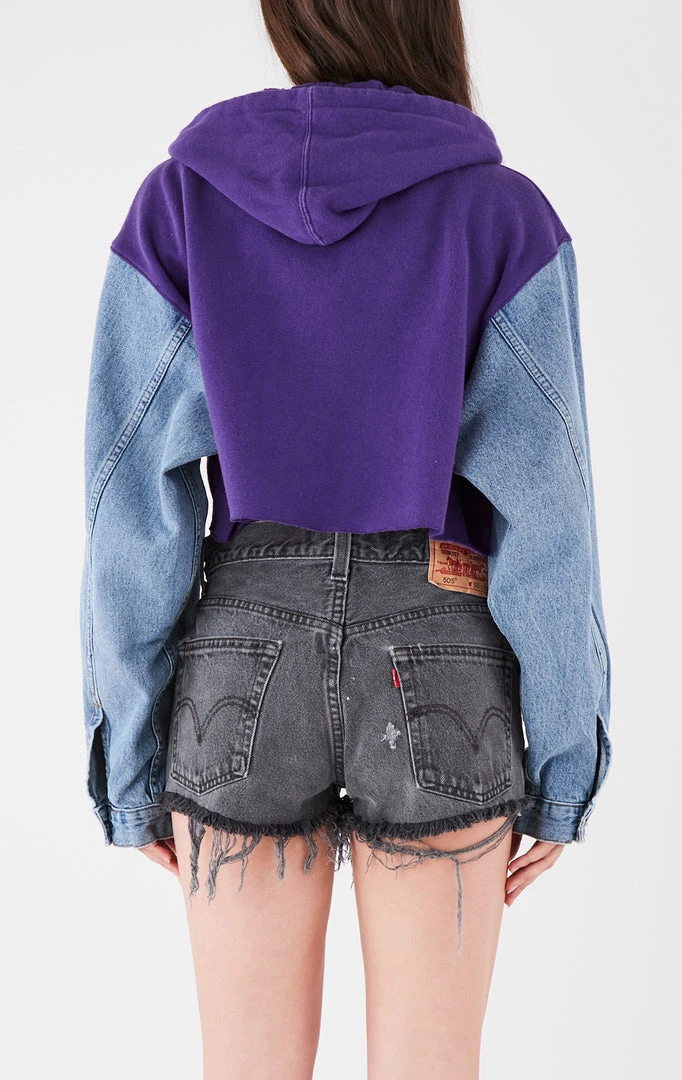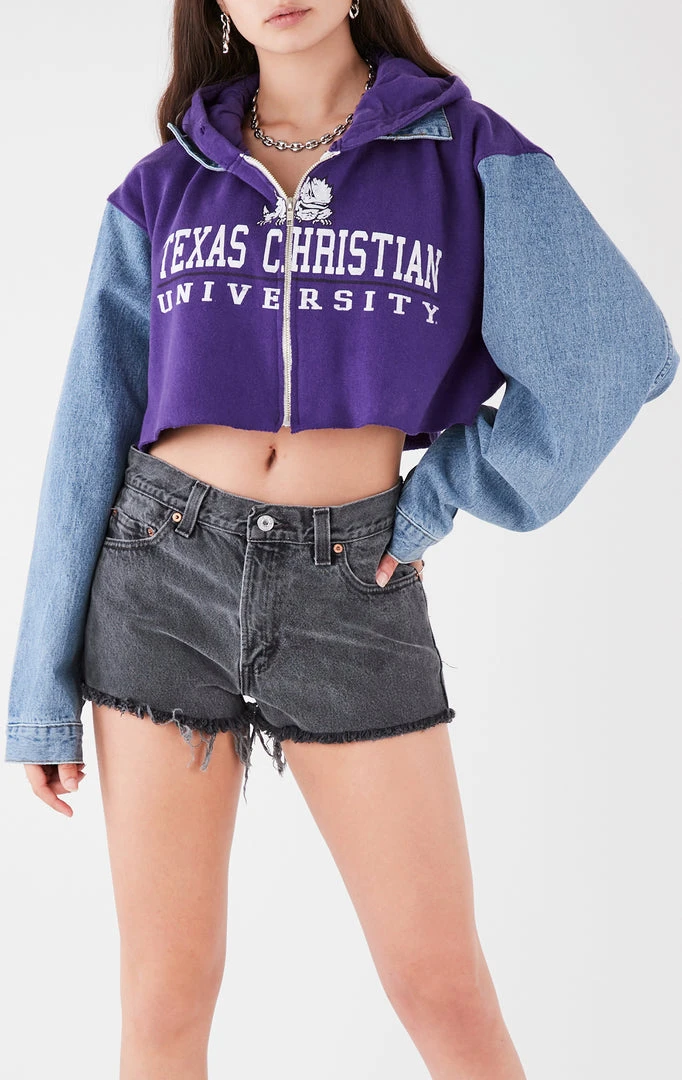 Furst of a Kind reworked this denim jacket, splicing it together with a vintage Texas Christian University hooded sweatshirt. Complete with denim collar and zipper closure.