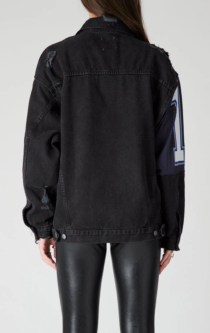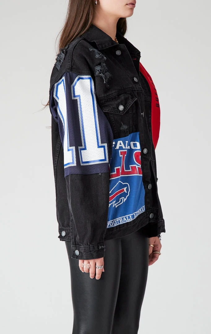 You need this Furst of a Kind reworked denim jacket. Hand sourced, sewn & spliced, this vintage Buffalo Bills patchwork denim jacket is the epitome of cool. Featuring assorted vintage graphic inserts throughout.