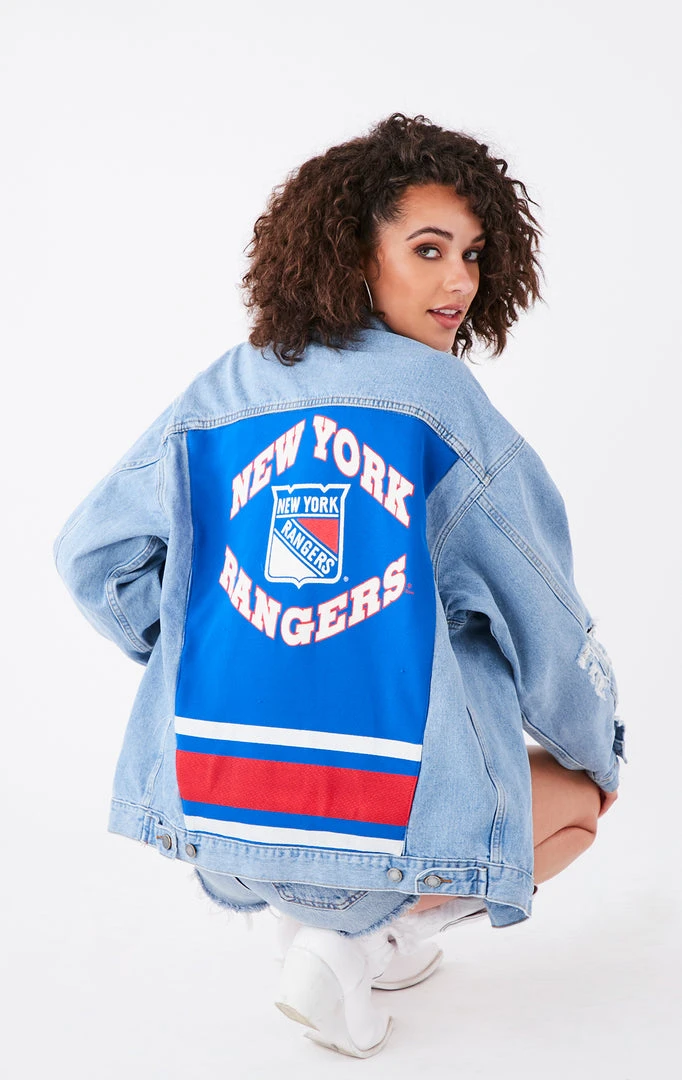 It’s all about the back detail on this one-of-a-kind repurposed blue denim jacket. Furst of a Kind reworked this denim jacket with a vintageĀ New YorkĀ Rangers graphicĀ insert on the back.
