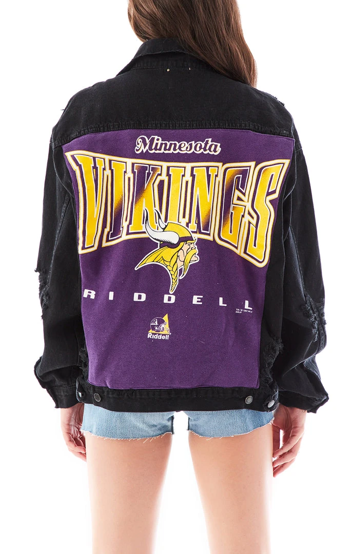 It’s all about the back detail on this one of a kind repurposed black denim jacket. Furst of a Kind added a vintage Minnesota Vikings sweatshirt insert and we are officially obsessed.