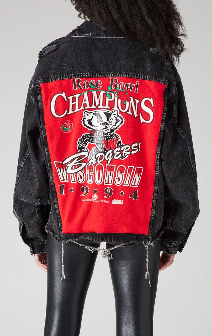 Hate to see you go, but love to watch you leave. It’s all about the back detail on this one of a kind repurposed black denim jacket. Furst of a Kind added a vintage University of Wisconsin graphic on the back and we are officially obsessed.Â