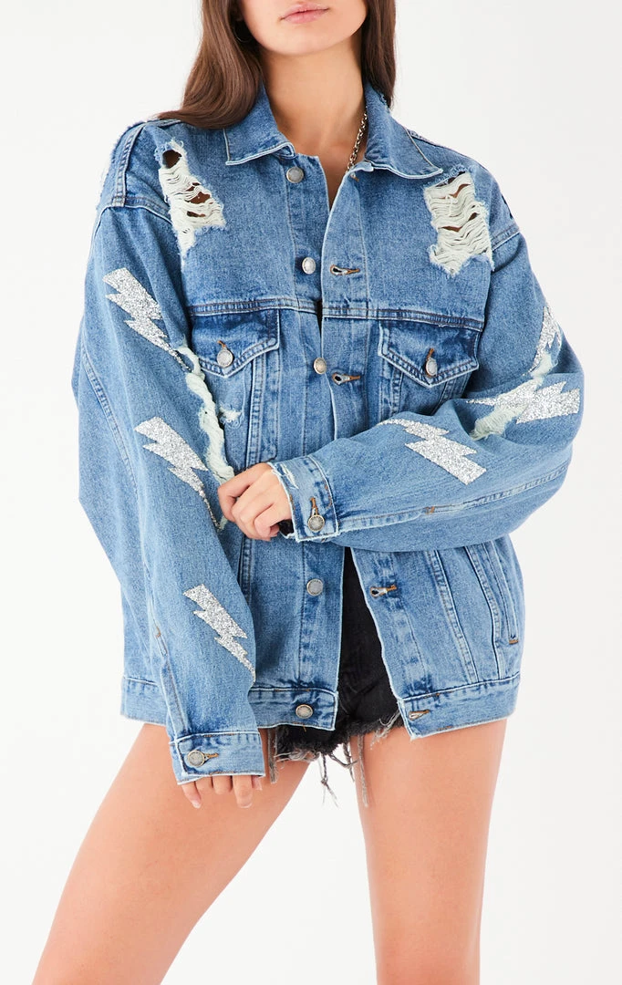 We are obsessed with the back detail on this one of a kind repurposed blue denim jacket. Furst of a Kind added a vintageĀ Tampa Bay LightningĀ graphic on the back of this jacket and silver lightning boltsĀ to the sleeves.Ā