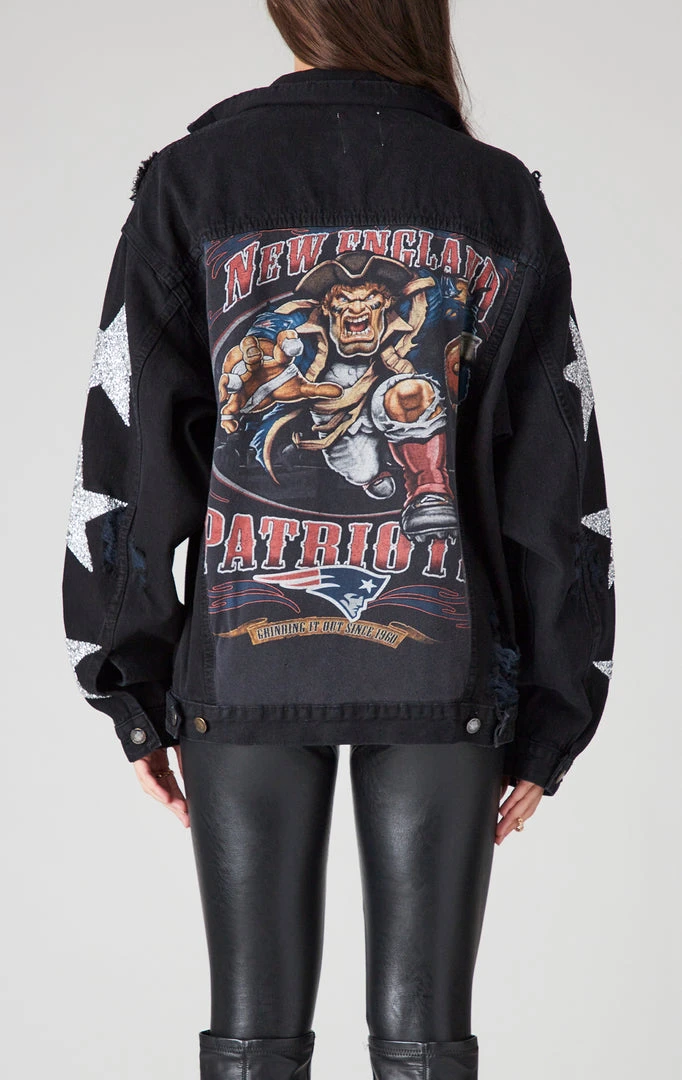 Hate to see you go, but love to watch you leave. We are obsessed with the back detail on this one of a kind repurposed black denim jacket, but it doesn’t stop there. Furst of a Kind added a vintage New England Patriots graphic on the back of this jacket and silver star patches to the sleeves. It’s safe to assume obsession.Â