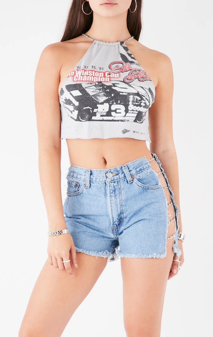 This vintage Nascar tee was upcycled by Furst of a Kind. Reworked in Los Angeles with halter neck, waterfall chain back detail and crop cut.