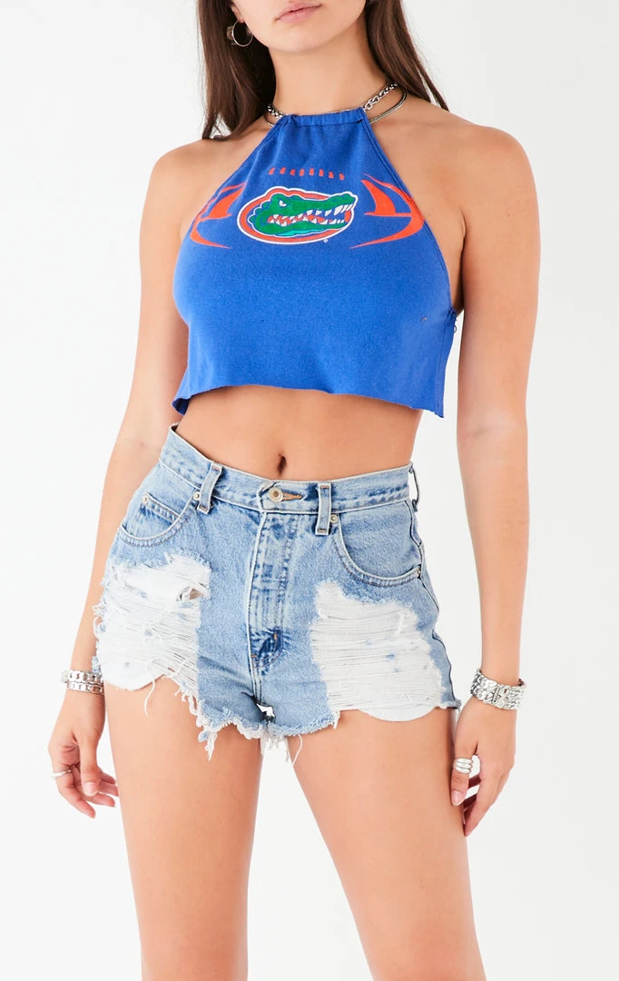 This vintage University of Florida tee was upcycled by Furst of a Kind. Reworked in Los Angeles with halter neck, waterfall chain back detail and crop cut.Â