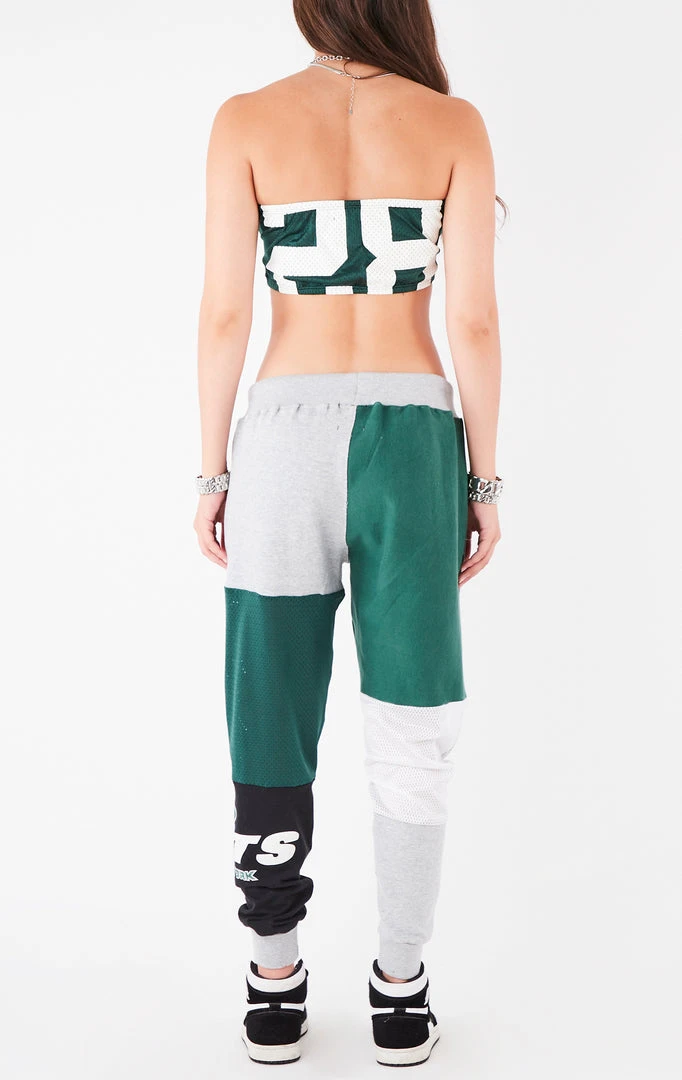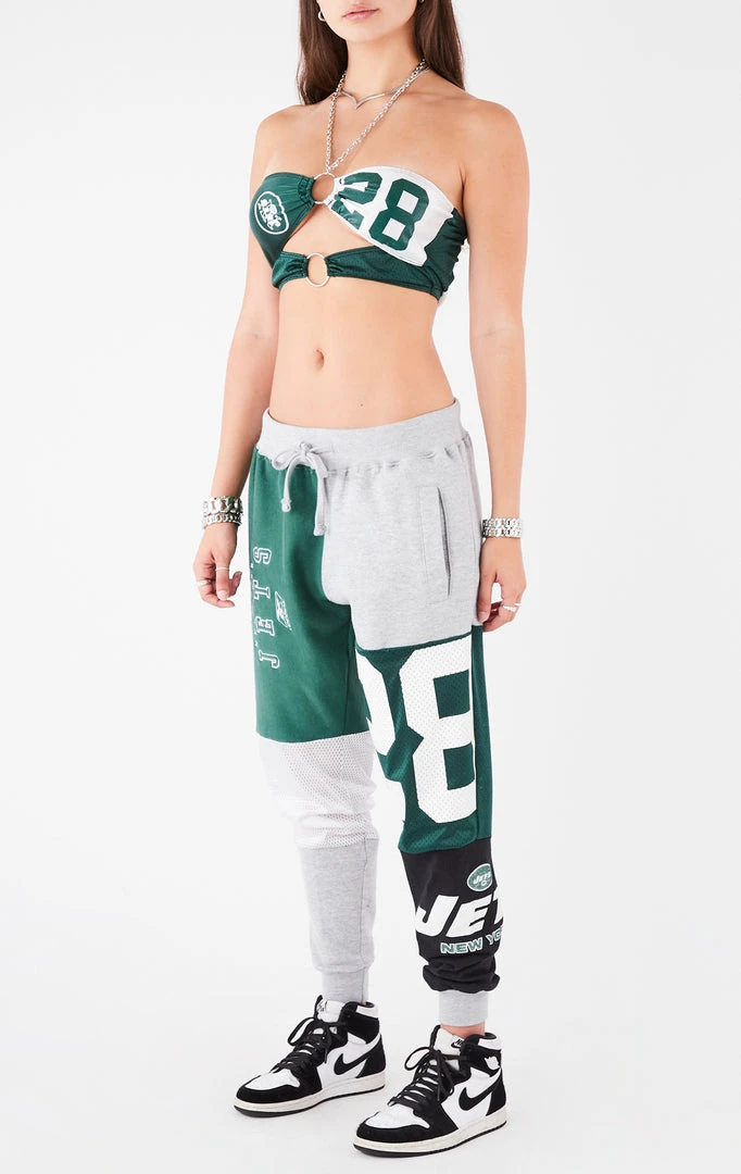 This vintage New York Jets jersey was reworked with a whole new shape. Features a flattering cut out, cropped length, chain halter and finished off with double o-rings.