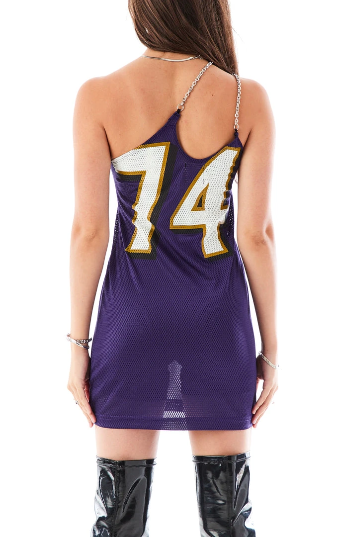 This one of a kind vintageĀ Baltimore Ravens jersey was handpicked in the USA and reworked into a one shoulder dress that’s a total knockout. Furst of a Kind redesigned thisĀ piece from scratch-Ā making it extra shiny for you with silver double chain detailing across one shoulder. It’ll be good for you and your closet, so get the dress.Ā