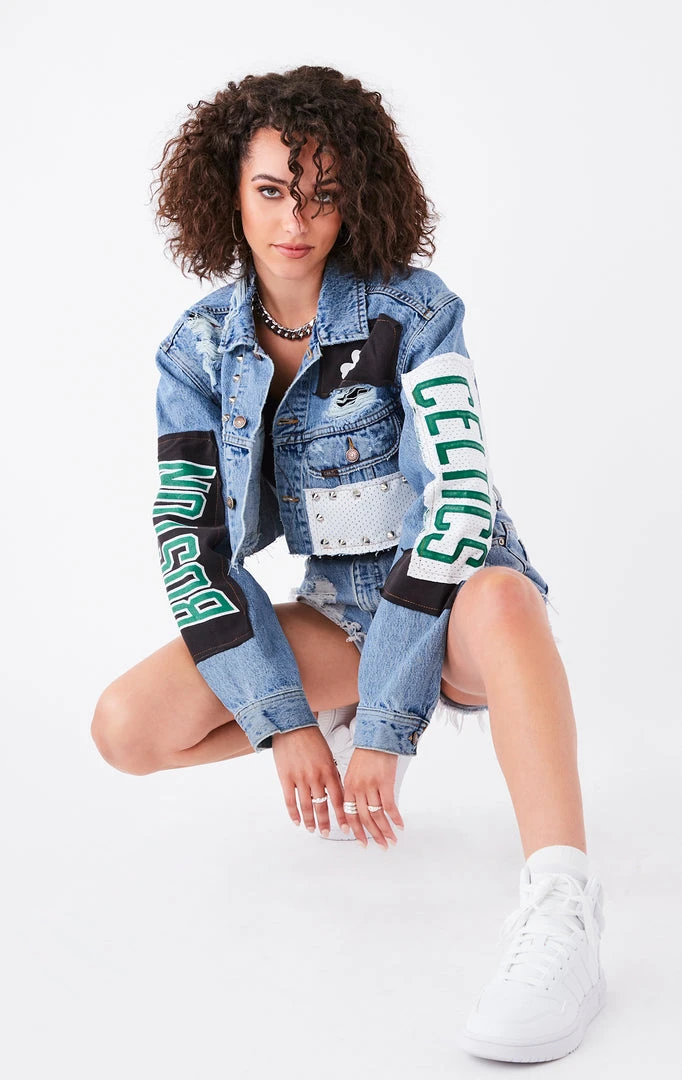 This reworked denim jacket was upcycled by Furst of a Kind. Crafted from the perfect oversized vintage Levi’s denim jacket body and patches from a vintage Boston Celtics tee and jersey. Finished off with studding and a cropped hem. Hand sourced and sewn in Los Angeles.