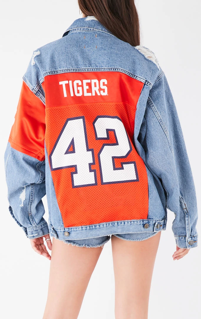 It’s all about the back detail on this one of a kind repurposed denim jacket. Furst of a Kind added a vintage Clemson University jersey insert across the back and layered it over the sleeve. We are officially obsessed.