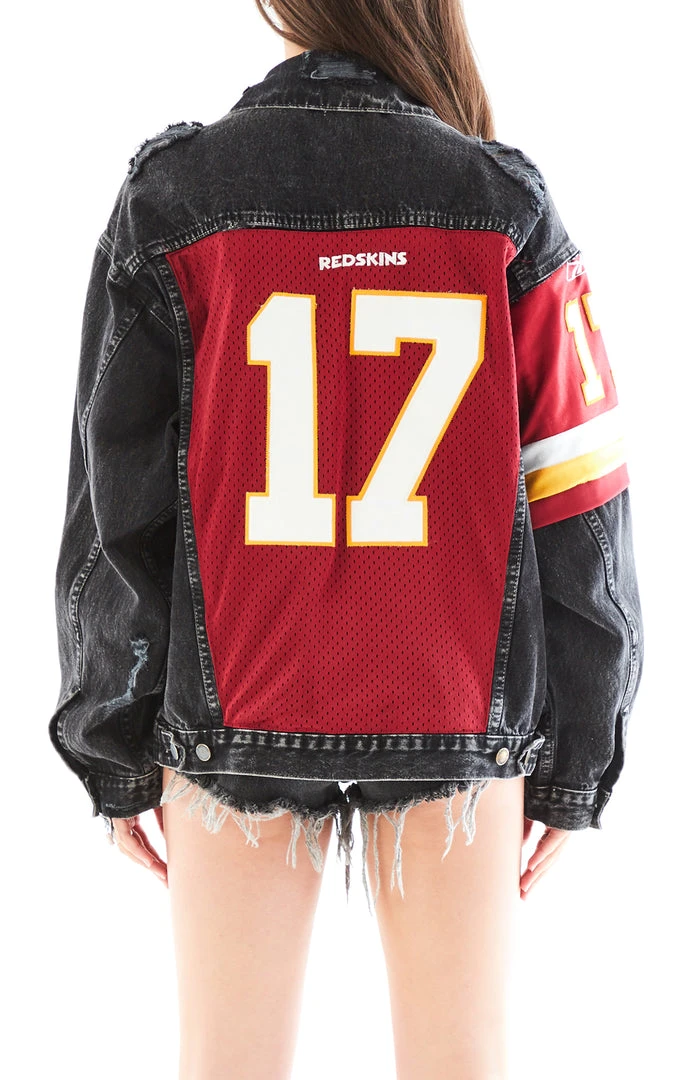 Hate to see you go, but love to watch you leave. It’s all about the back detail on this one of a kind repurposed denim jacket. Furst of a Kind added a vintage Washington Redskins jersey insert across the back and layered it over the sleeve. We are officially obsessed.Â