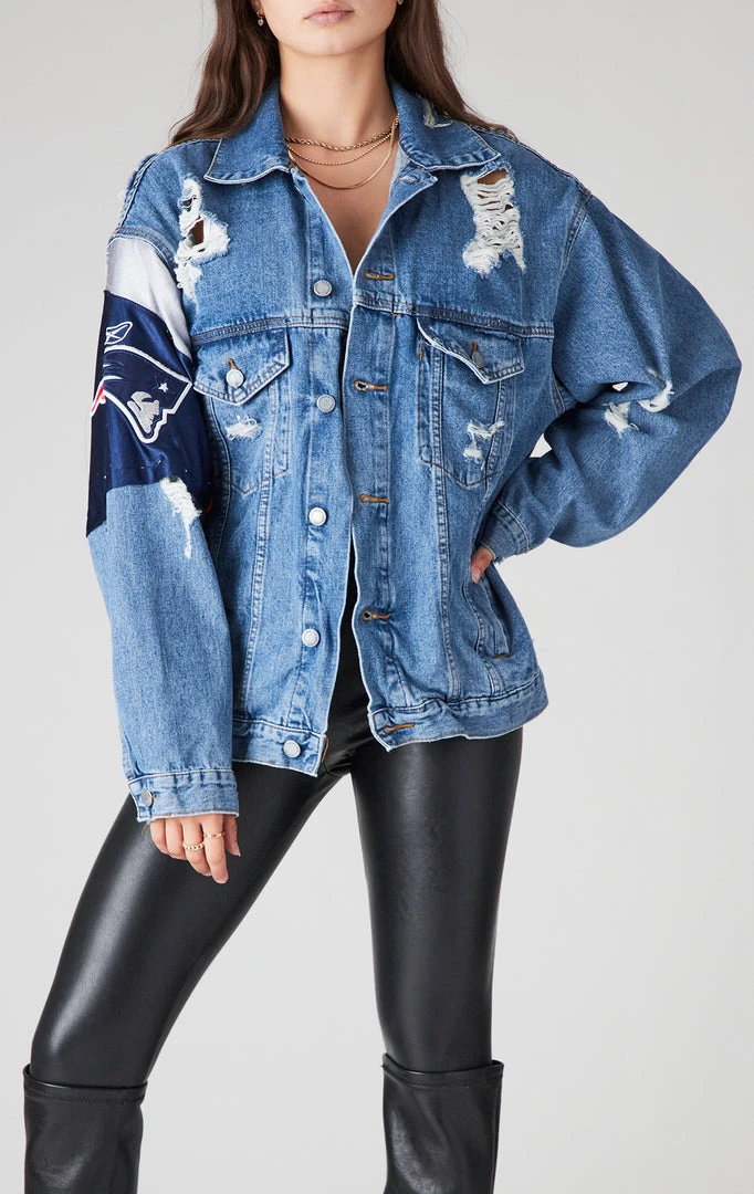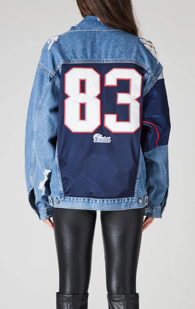 Hate to see you go, but love to watch you leave. It’s all about the back detail on this one of a kind repurposed denim jacket. Furst of a Kind added a vintage New England Patriots jersey insert across the back and layered it over the sleeve. We are officially obsessed.Â