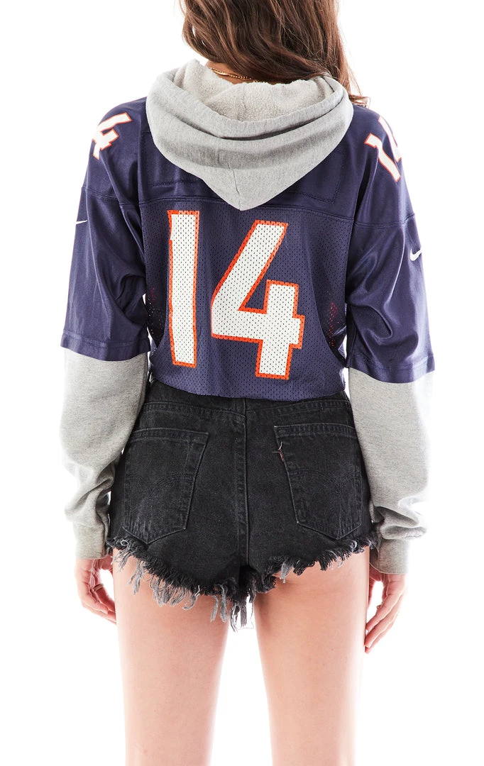 You’re serving major 90’s vintage layered vibes in this Denver Broncos jersey spliced Hoodie. Furst of a Kind gave two vintage pieces a new life with this reworked stunner. You’ve got a sweatshirt hoodie spliced together with a sick football jersey paired with sweatshirt sleeves and cropped to perfection. Touchdown, baby.