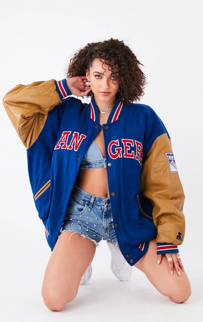 This vintage leather New York Rangers jacket gives one of a kind a whole new meaning. The Furst of a Kind vintage team is constantly searching the U.S. for the best of the best in Vintage, and we’ve opened the archives for you. Leather sleeve design, button closure and a classic bomber silhouette make this the oversized jacket of your dreams.